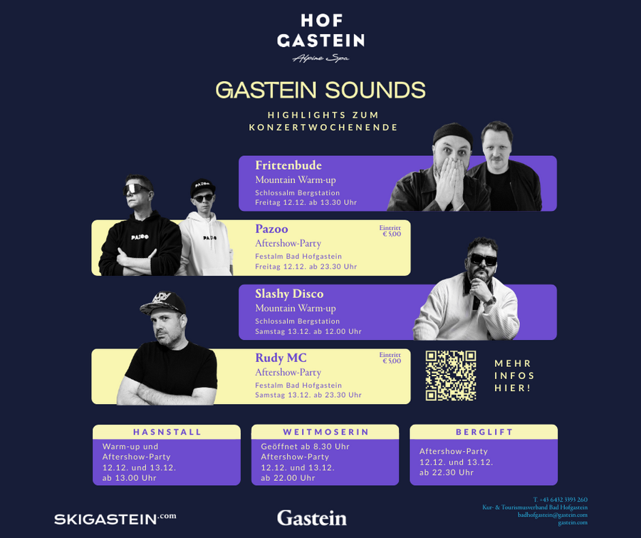 Zieht euch also warm an für diesen Winterzauber: Das GASTEIN SOUNDS ist nämlich gekommen, um zum vorweihnachtlichen, musikalischen Highlight in Österreichs Bergen zu werden! Eingebettet ins malerische Salzburger Land, direkt am Fuße der Schlossalmbahn, präsentiert ARCADIA LIVE in Kooperation mit dem Kur- und Tourismusverband Bad Hofgastein sowie den Gasteiner Bergbahnen nun DIE Open-Air-Sause des Winters!